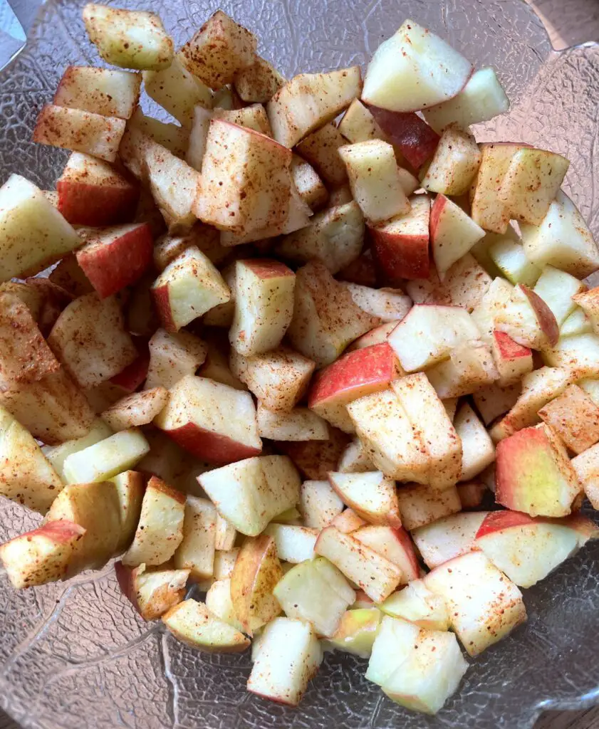 Schneidet anschließend die Äpfel in kleine Würfel, vermengt sie mit Zimt und Zucker und lasst sie einen Moment lang im Topf köcheln. Die Konsistenz der Äpfel soll etwas weicher werden, da die Apple Pie Muffins später nur kurz in den Ofen kommen.
