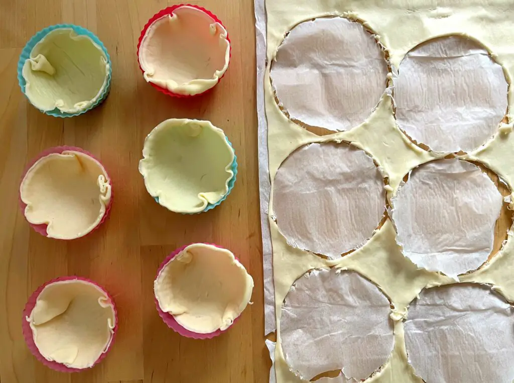 Rollt den Flammkuchenteig aus und stanzt mithilfe eines Glases Kreise aus dem Teig. Diesen müsst ihr dann in Muffinförmchen legen. (Idealerweise in eine Metallform, aber die aus Silikon gehen auch!).