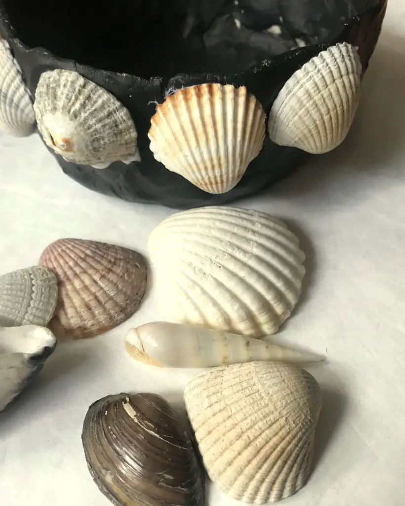 Am nächsten Tag könnt ihr weiterarbeiten. Ich habe mir Farbe und Muscheln zur Hand genommen. Auch hier bin ich keinem Plan nachgegangen. Die Hände und die Inspiration wussten von selbst, was sie fabrizieren wollten! Übrigens trocknet die Farbe erstaunlich schnell auf dem Ton. Mit Sekundenkleber sind die Muscheln auch fix auf mein Gefäß (das später ein Blumentopf werden soll) geklebt.