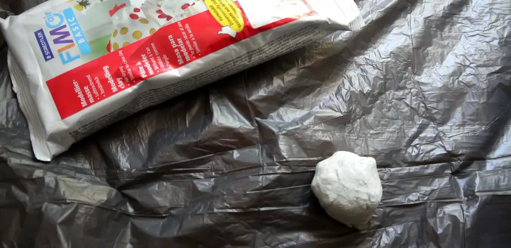 Zunächst breitet ihr eine Folie oder Tüte auf eure Arbeitsfläche aus, damit ihr arbeiten könnt, ohne dass etwas klebt. Für die „Masse“ könnt ihr euch aussuchen, was euch lieb ist. Ich habe mich für selbsttrocknende Modellierknete entschieden, aber Salzteig tut es auch. Diesen könnt ihr auch leicht selber machen – es lohnt sich nicht, den extra zu kaufen!