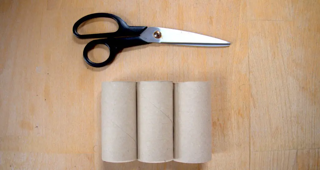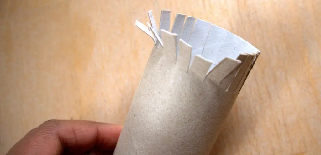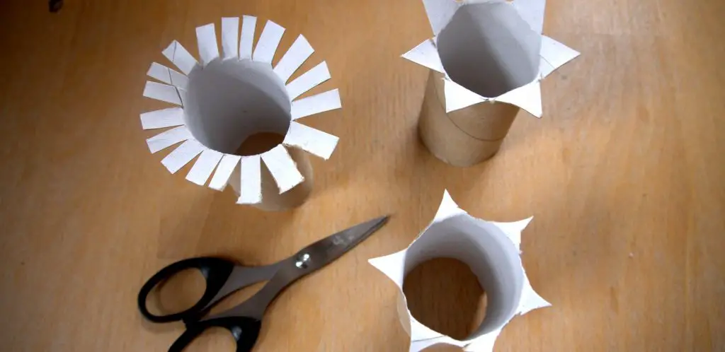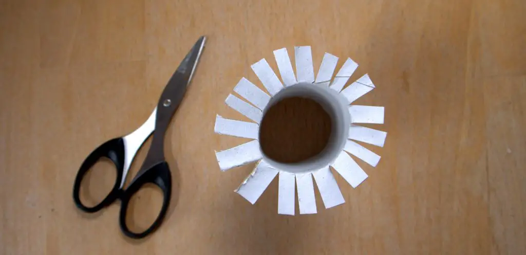 Ihr überlegt euch zunächst ein Muster. Wie sollen die Blumen aussehen? Mit vielen Blüten? Oder mit spitzen Blüten? Wir haben sie alle ausprobiert. Der Anfang ist immer gleich: Zunächst schneidet ihr an eine Seite der Klopapierrolle ein Muster ein. Entscheidet ihr euch für das Muster der blauen Blumen, dann schneidet einfach ein paar viele Rillen mit einem kurzen Abenstand ein.