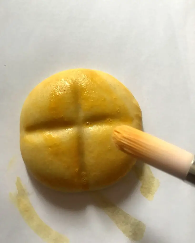 Nachdem euere Teigteilchen ausgekühlt sind, müsst ihr sie nur noch ausmalen. Hierfür eignet sich Tuschfarbe ganz gut, denn sie hat den Vorteil, dass sie sich gut verdünnen lässt und schnell trocknet. Für die Brötchen habe ich verdünntes ockergelb genommen. Die Brote haben einen dunkelbraunen Anstrich bekommen. Die Croissants habe ich mit zwei Schichten Gelb bemalt und die Brezeln in einem dunklen, Fuchsrot.