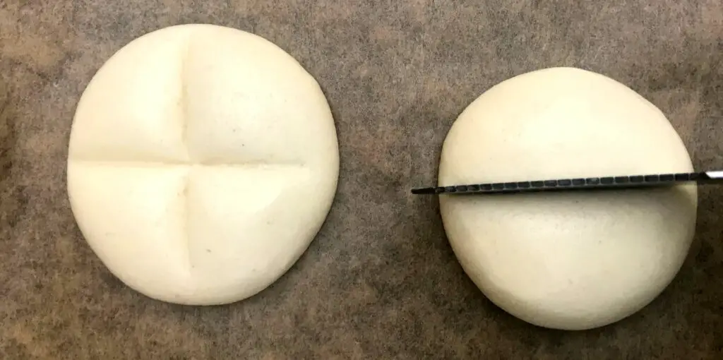 Die Brötchen, Semmeln oder auch Schrippen, wie die Berliner*innen sagen, sind am leichtesten. Nehmt euch ein bisschen Teig und formt ihn zu einer Kugel. Die Rillen könnt ihr mithilfe eines Messers eindrücken – entweder eins oder zwei, die übereinander gekreuzt sind!