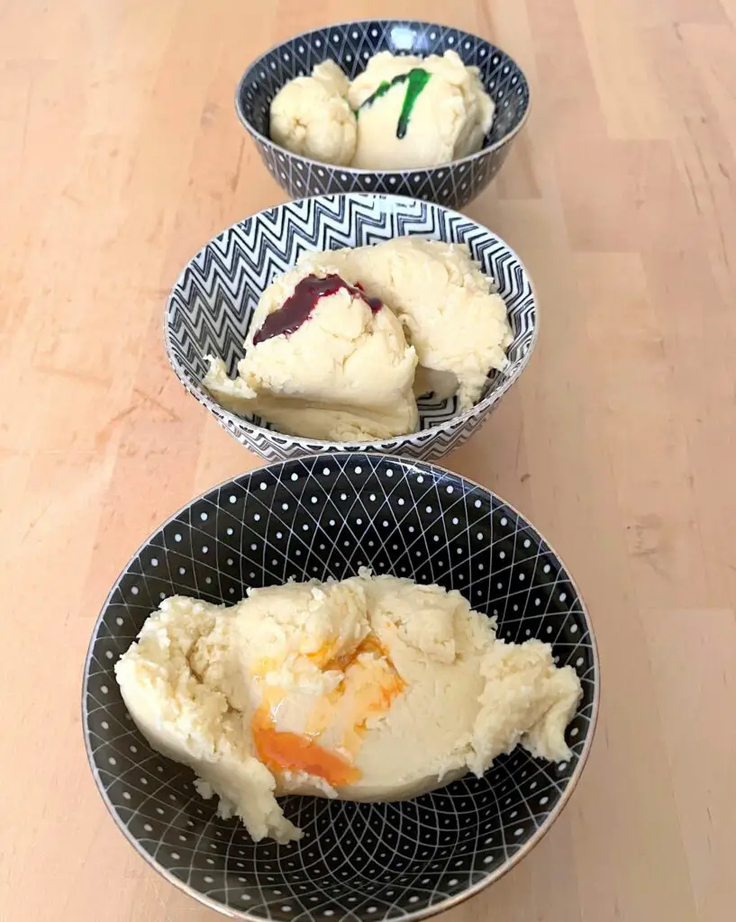 Nun zum Färben des Teiges: Teilt den Teig in drei kleine Klöpse und gebt etwa einen TL Lebensmittelfarbe hinzu. Ich habe die Farbe mit der Hand reingeknetet, aber ihr könnt auch ein Handrührgerät nehmen, oder noch besser eine Küchenmaschine.