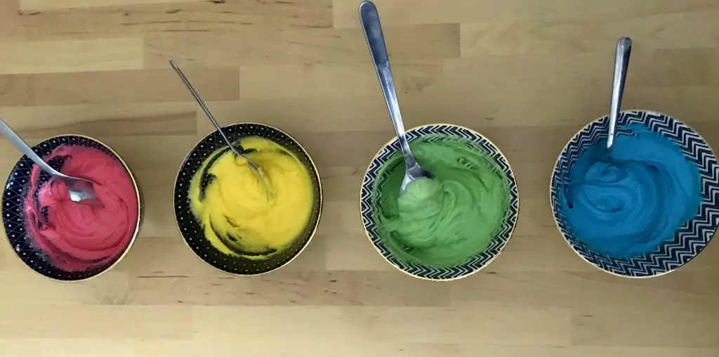 Und bunte Lebensmittelfarbe in den Farben Blau, Grün, Gelb und Rot