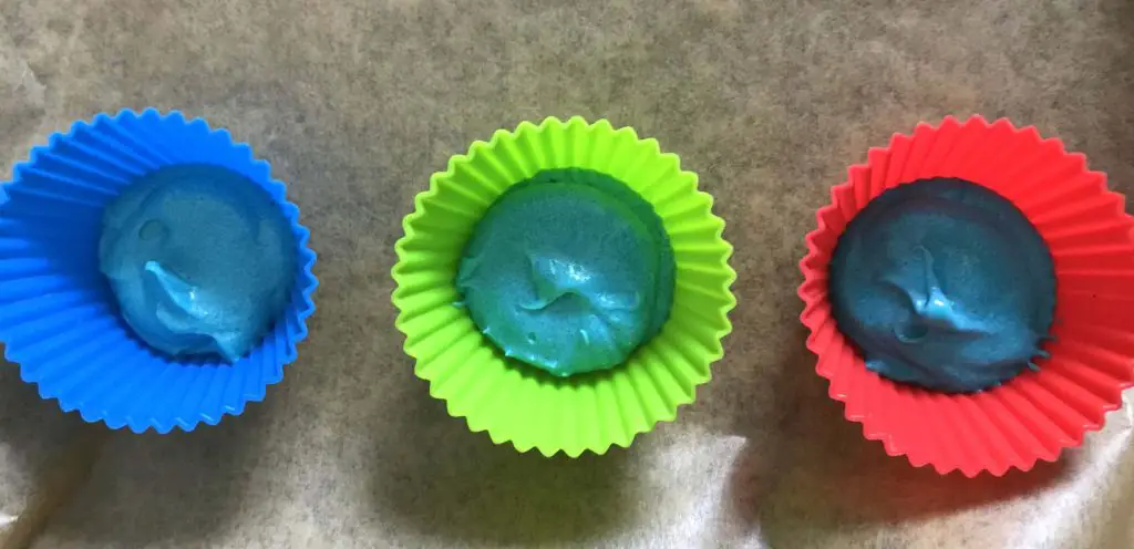 Weiter geht es mit Befüllen der Cupcakes ganz nach dem Regenbogen-Charme. Hierfür müsst ihr zunächst einen Esslöffel des blauen Teigs hineinfüllen. Darüber kommt der grüne. Darüber der gelbe und zum Schluss der rote.
