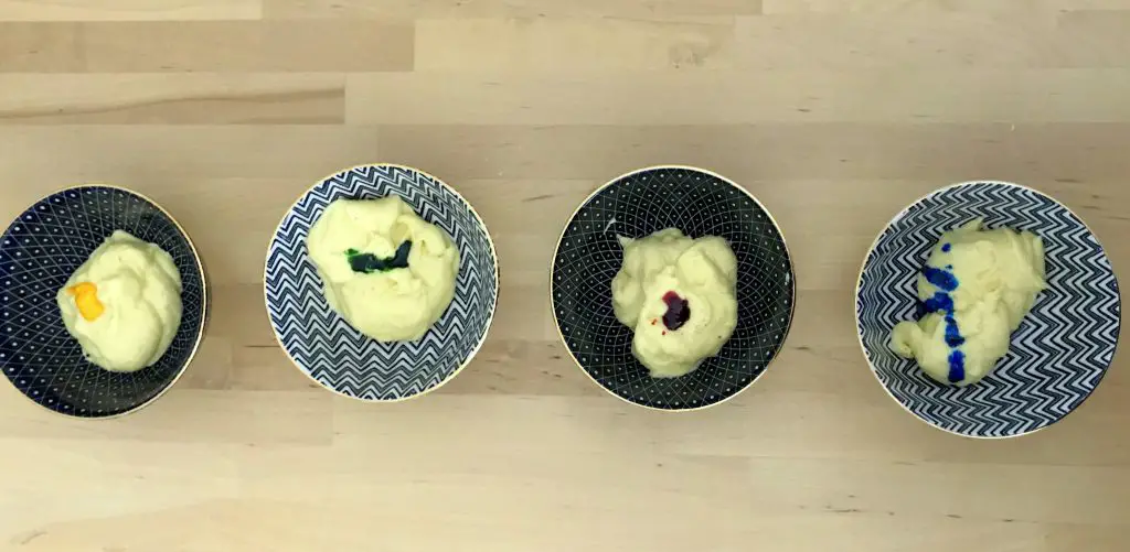 Dann vierteilt ihr euren Teig und gebt ihn in vier Schüsseln.