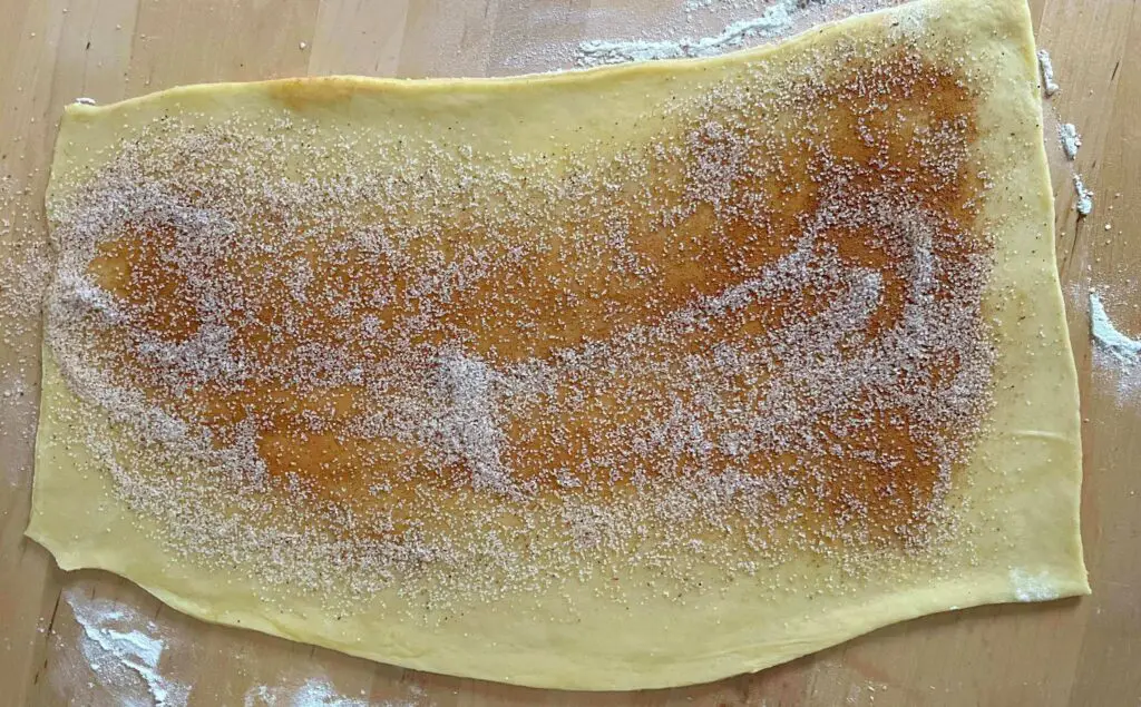 Im nächsten Schritt müsst ihr den Teig auf einer bemehlten Arbeitsfläche dritteln. Rollt den Teig zu einem Rechteck aus und bestreicht ihn entweder mit Butter – oder wie in meinem Fall mit Zimt und Zucker.