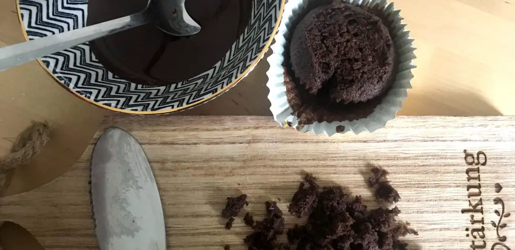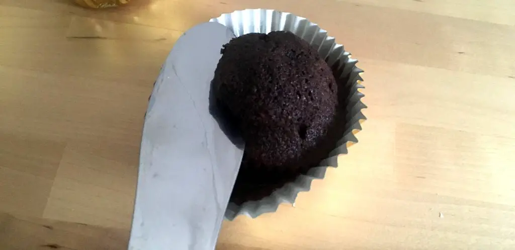 Auf den geschnittenen Muffin streicht ihr eine feine Schicht Schokolade, damit ihr die Krümel wieder auf die Muffins legen könnt und diese schön haften. Drückt sie ruhig ein wenig mit der Hand fest, damit sie nicht herunter krümeln.