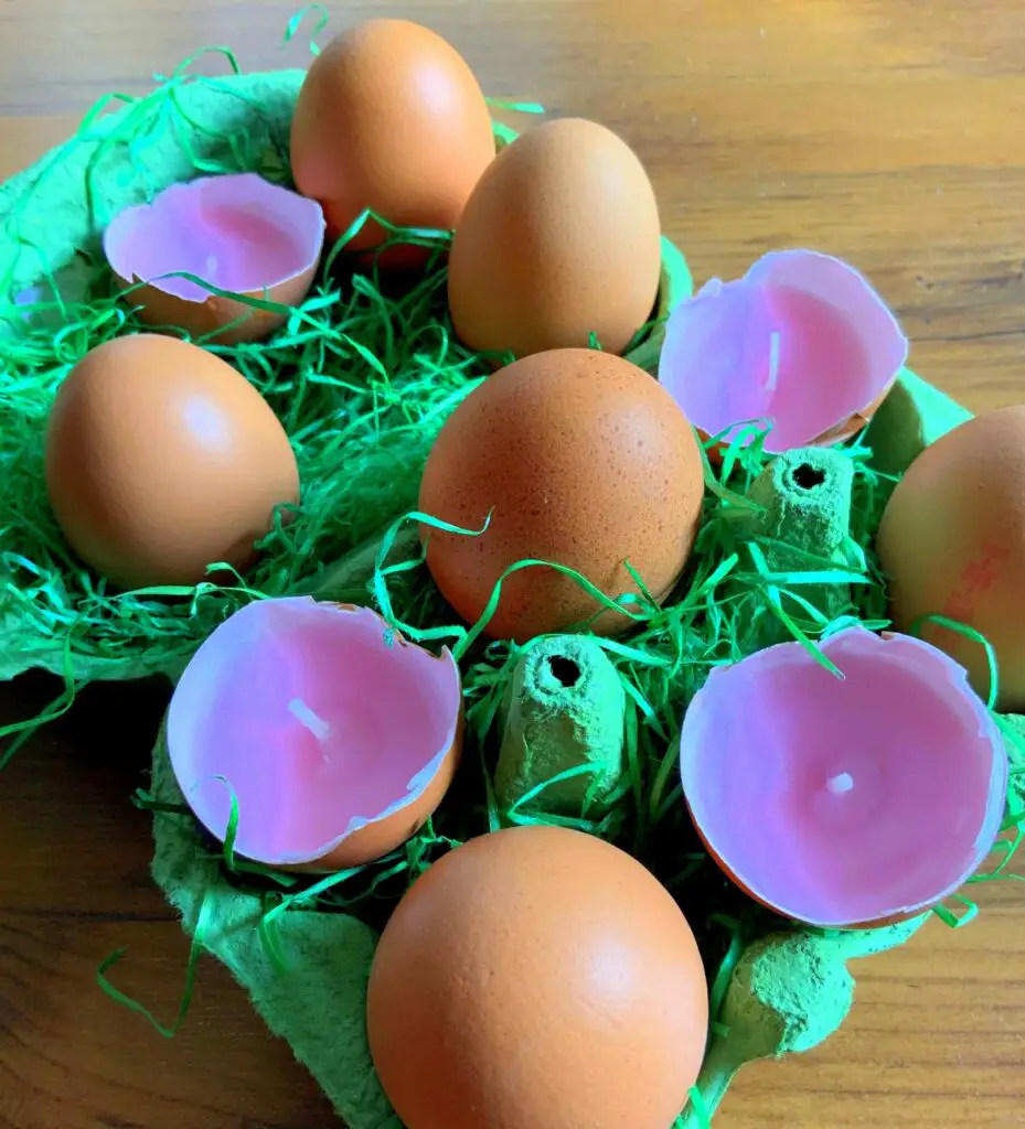 Schmelzt so viele Kerzen wie ihr Osterteelichter habt, sprich: Eine Portion Wachs aus einem Teelicht ergibt eine halbe Eierschale.