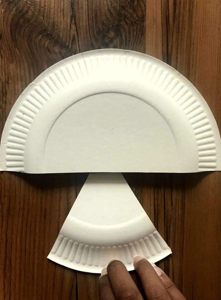Für den Pilz benötigt ihr einen runden Pappteller, den ihr einmal in der Mitte halbiert. Die erste Hälfte wird der Kopf des Pilzes sein, aus der anderen wird der Stiel geschnitten. Der Stiel muss wie ein Trapez geformt sein, dass nach oben hin immer schmaler wird.