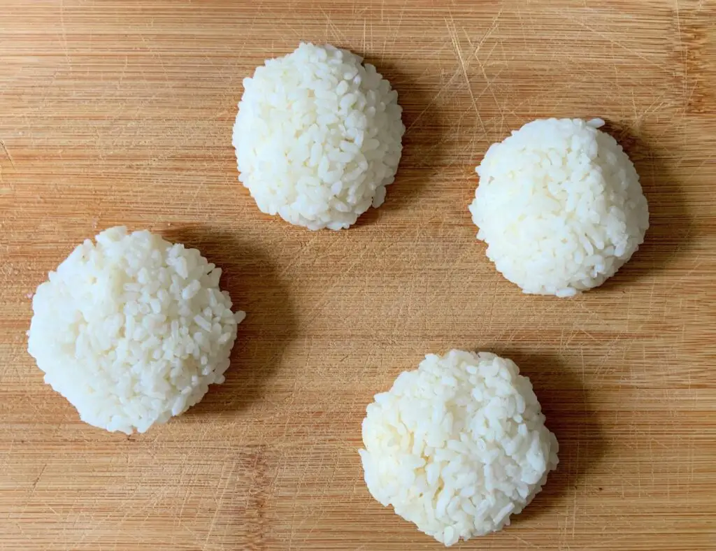Wenn der Reis fertiggekocht ist, könnt ihr ihn einen Moment lang abkühlen lassen, bevor ihr Pattys daraus formt. Je nachdem wie groß der Burger werden soll, braucht ihr ein, zwei oder drei EL pro Patty.