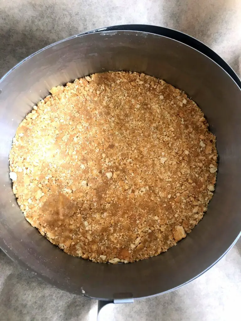 Zunächst müsst ihr die Kekse zerkrümeln – dafür könnt ihr einen Kartoffelstampfer nehmen, oder die Kekse in eine Tüte packen und mit einem Nudelholz bearbeiten. Anschließend erhitzt ihr die Butter, vermischt sie mit den Keksbröseln und legt die Masse plattgedrückt in eure Kuchenform. Fertig ist euer Keksboden.