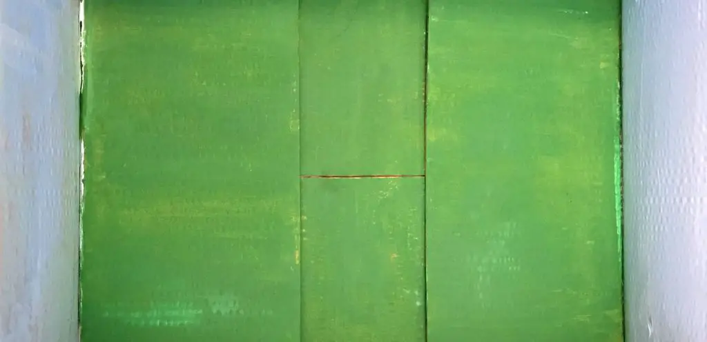 Anschließend müsst ihr den Karton bemalen. Der Boden wird grün, der Rand eine Mischung aus weiß und blau (ich wollte einen Kicker unter freiem Himmel).