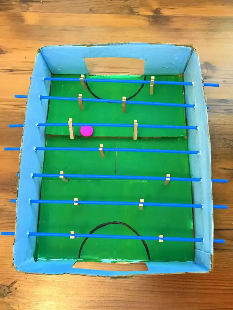 Hier kommt eine coole Idee, wie ihr einen Fußball-Kicker aus einem alten Karton basteln könnt!