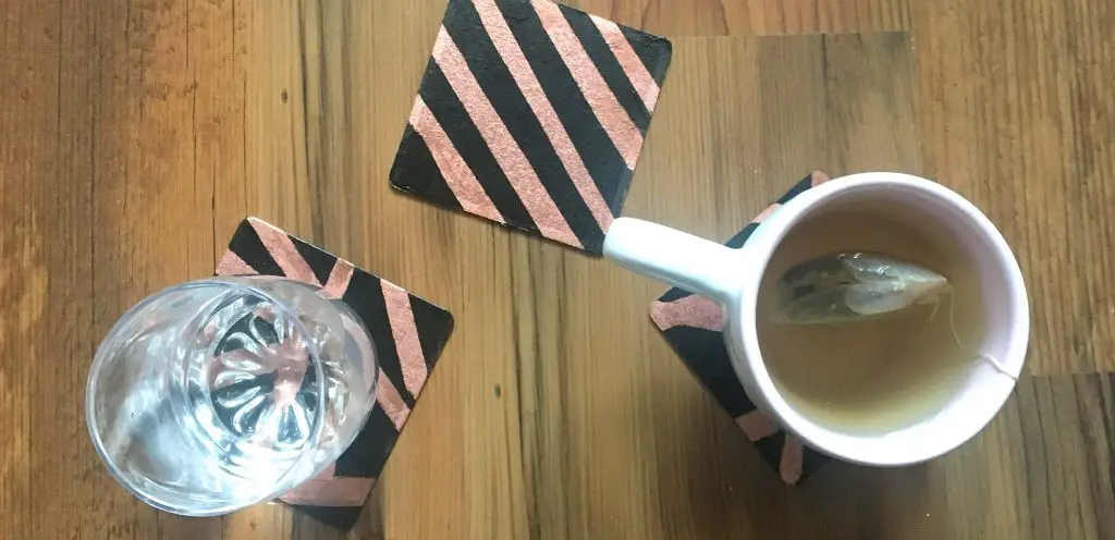 Nun geht es an das Muster. Hier könnt ihr eurer Kreativität freien Lauf lassen. Falls ihr aber auch geometrische Muster wollt, dann macht ihr folgendes: Nehmt einen dünnen Tesafilmstreifen und platziert ihn dort, wo ihr das Muster hin haben wollt. Ich habe einen Getränke-Untersetzer nur aus proportionalen Streifen gemacht und habe sie bei den anderen ganz nach Lust und Laune beklebt.