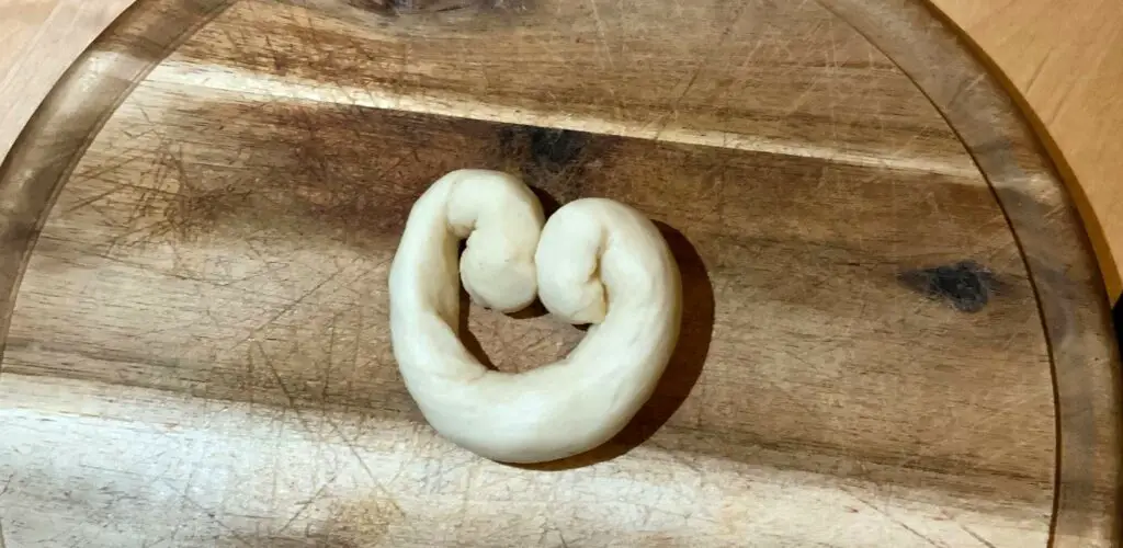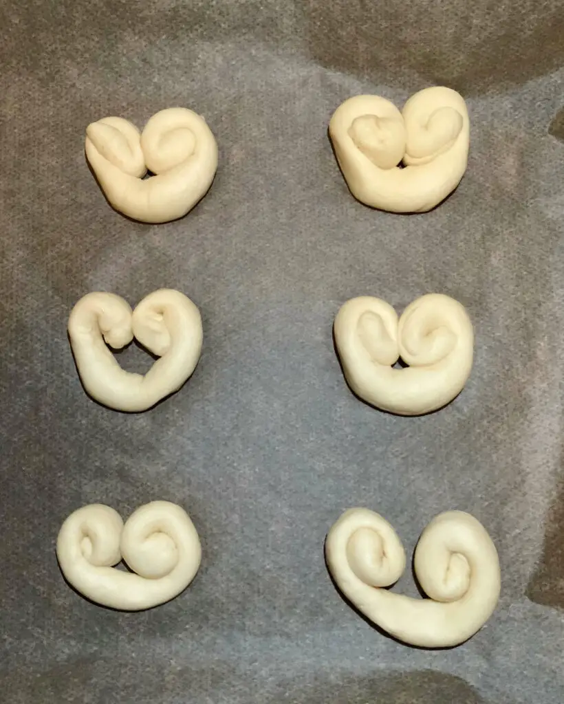 Schnappt euch etwas Teig (etwa so groß wie ein Golfball) und rollt ihn zu einer Wurst aus. Für die Herzoptik müsst ihr die „Wurst“ von beiden Enden nach innen einrollen – ganz ähnlich wie die Schweineöhrchen.