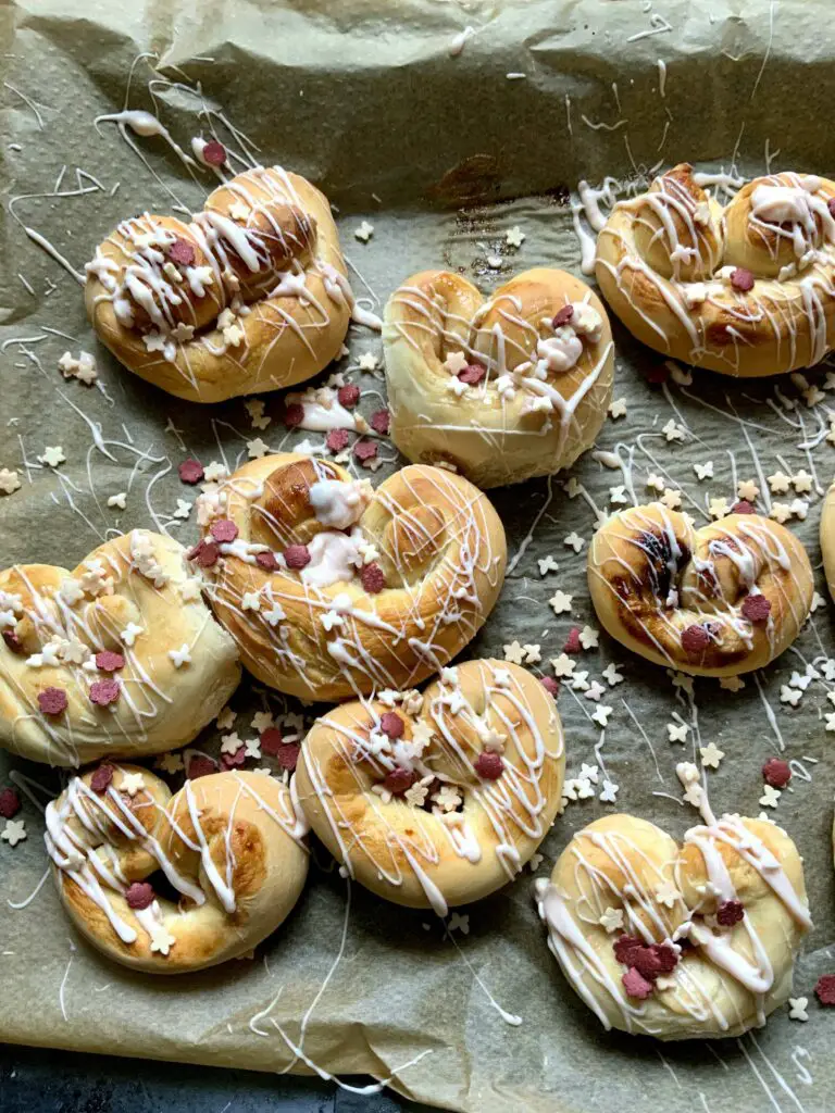 Wenn eure Hefeherzen abgekühlt sind, könnt ihr sie dekorieren. Ich habe weiße Schokolade mit einem Tropfen Lebensmittelfarbe gemischt, mit einer Gabel über die Hefeherzen geträufelt, und am Ende ein paar Streusel darübergestreut!