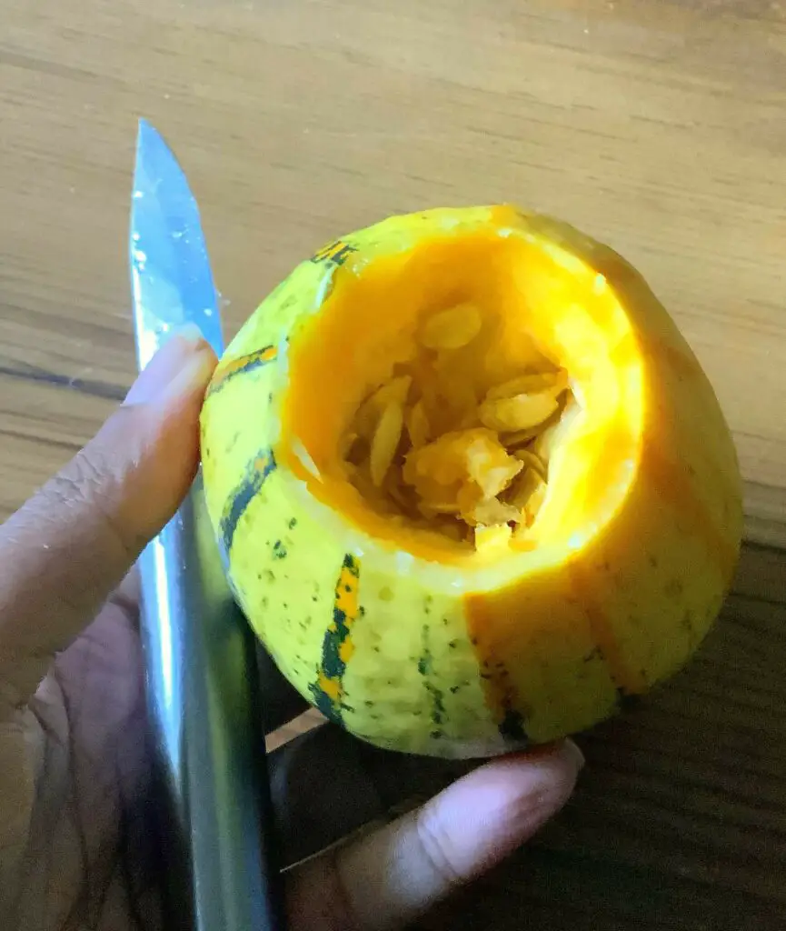 Der Kürbis soll im Übrigen nicht ausgehöhlt werden. Entfernt nur den oberen Teil, damit ihr das Teelicht ordentlich reinsetzen könnt. Wenn ihr ihn zu sehr aushöhlt, fällt der Kürbis hinein.