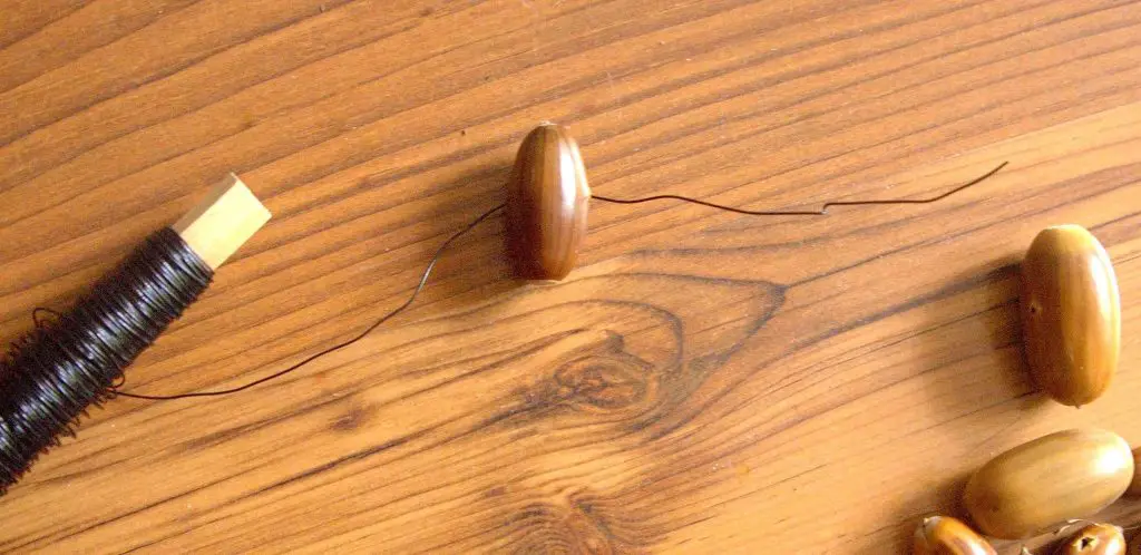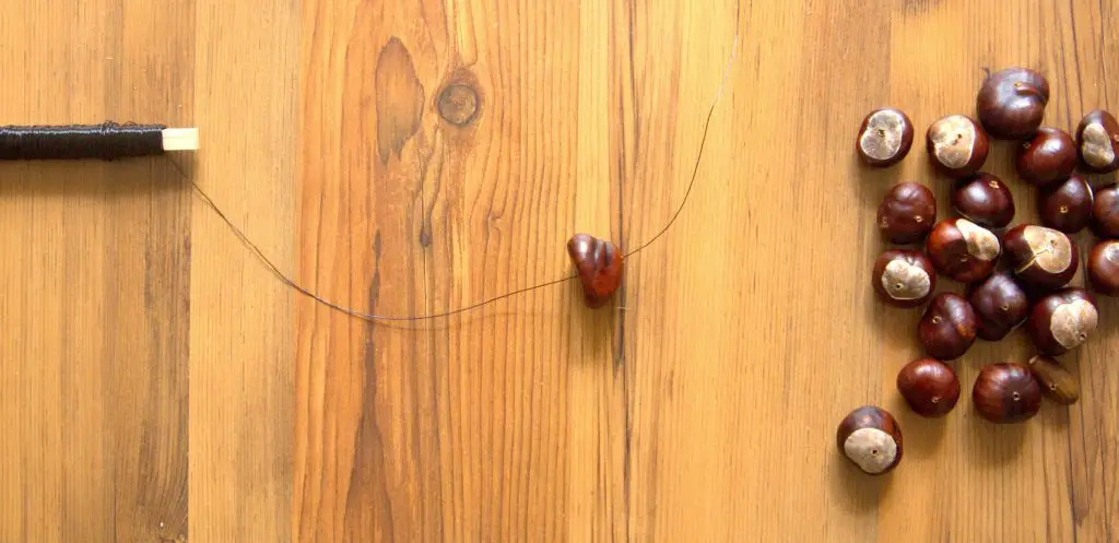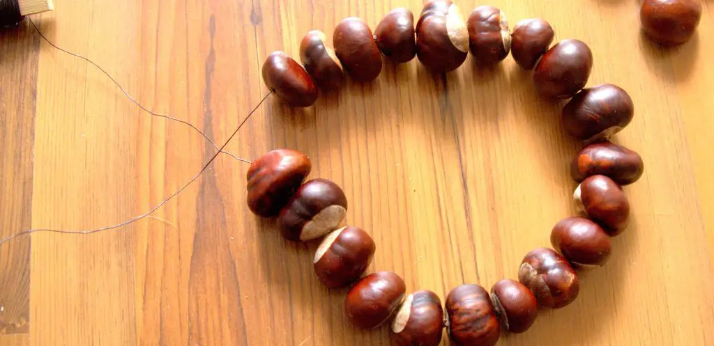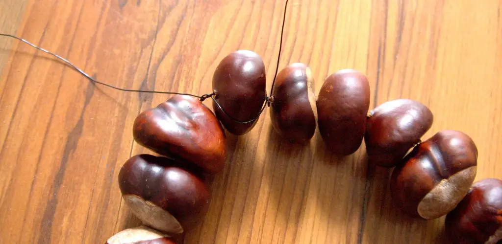 Als nächstes nehmt ihr den Draht und fädelt die Kastanien nacheinander ein. Kleiner Tipp: Ein runder Draht eignet sich sehr viel besser, weil er seine Form nicht verliert!