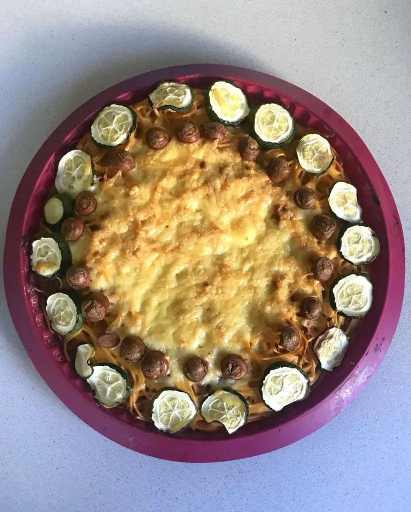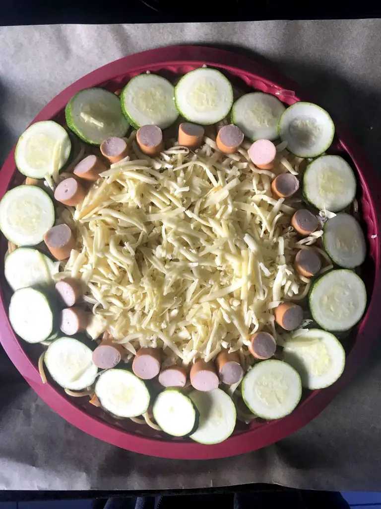Zum Schluss füllt ihr eure Spagetti in eine Tarte Form oder ein rundes Kuchenblech. Verziert die Oberfläche gern wie eine kreative Tarte. Ich habe mich für Zucchini und Wiener Würstchen entschieden. Und natürlich gaaanz viel Käse!