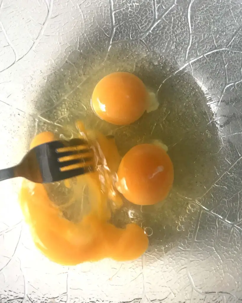 Nun zum vorletzten Schritt. Ich weiß nicht genau, ob ihr den weglassen könnt, aber ich habe ihn gemacht, weil ich wollte, dass die Spagetti eine Art Bindemittel kriegen und am Ende festbleiben. Wenn ihr sicher gehen wollt, dass sie am Ende auch halten, könnt ihr noch 3-4 Eier verquirlen und am Ende mit der Spagetti Masse vermischen.