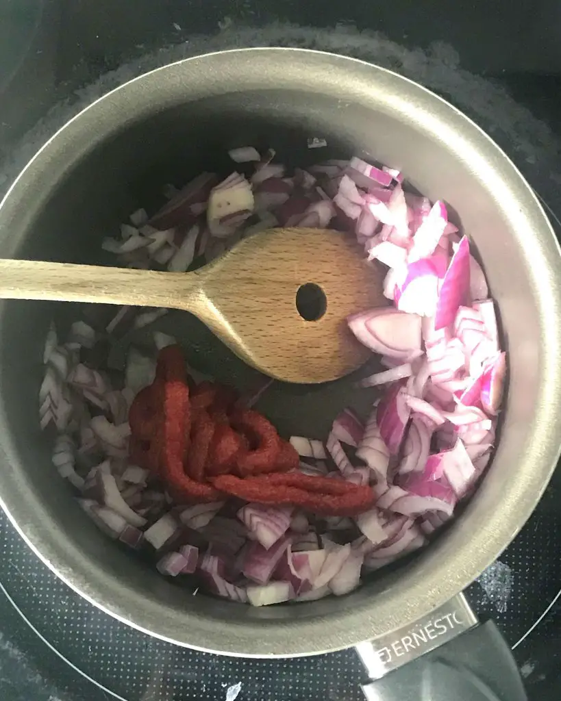 Während die gekochten Spagetti etwas auskühlen, könnt ihr euch schonmal an die Sauce hermachen. Hierfür müsst ihr Zwiebeln kleinschneiden, anbraten und mit etwa 3 EL Tomatenmark vermengen.