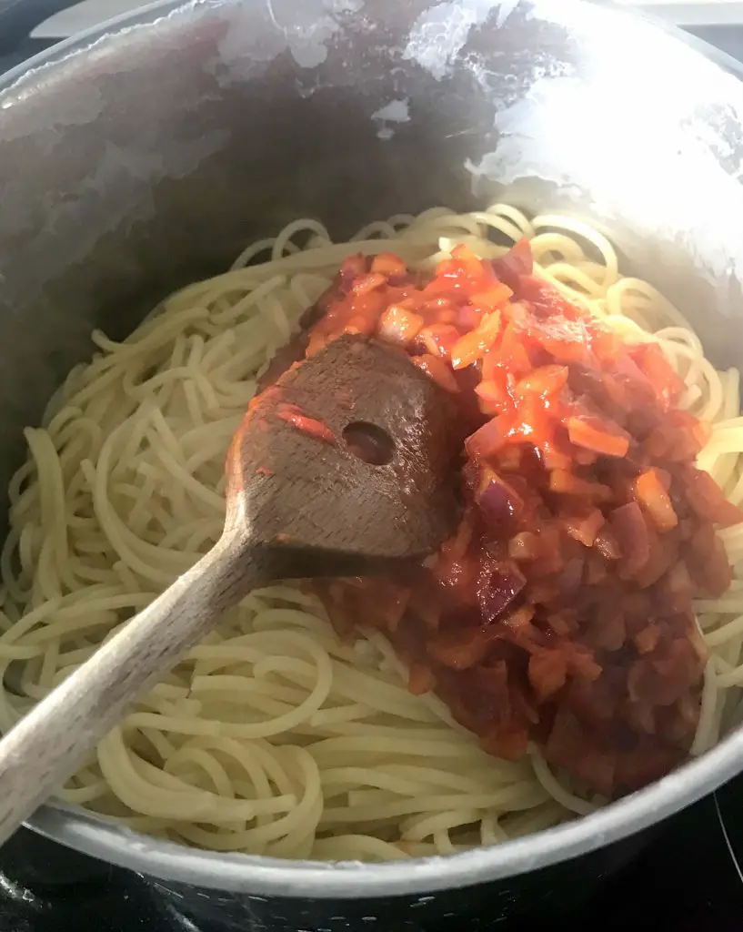 Nun müsst ihr eure Sauce mit den Spagetti vermengen. Nehmt als „Schüssel“ ruhig den Topf, in dem ihr die Spagetti gekocht haben – das spart euch zusätzliches Abwaschen.