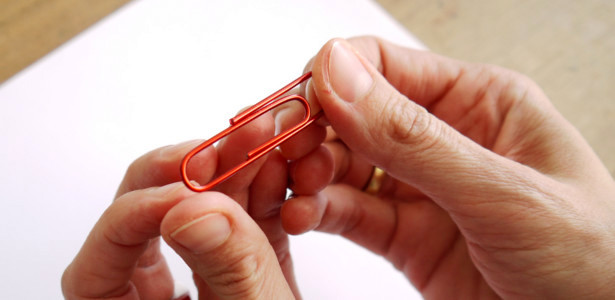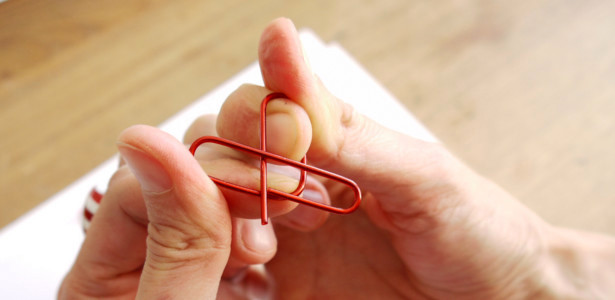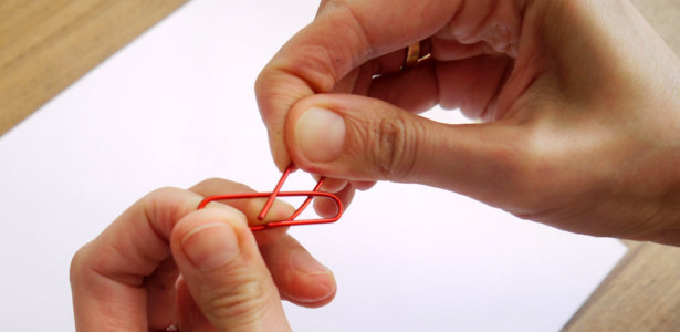 Haltet die Klammer waagerecht in den Händen und achtet darauf, dass die lange Schlaufe nach oben gerichtet ist.
