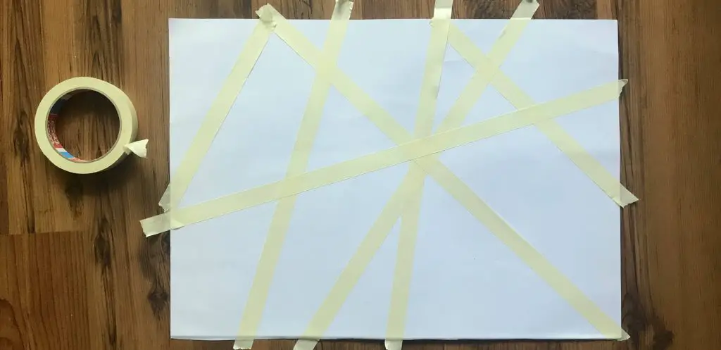 Der Anfang ist leicht. Schnappt euch eine Keilwand oder ein Stück Pappe, und beklebt sie mit Kreppband. Egal, wie ihr beklebt – am Ende wird es sehr kunstvoll aussehen. Das Gute an Kreppband ist, dass es leicht abzureißen ist, und vor allem wieder abgeht.