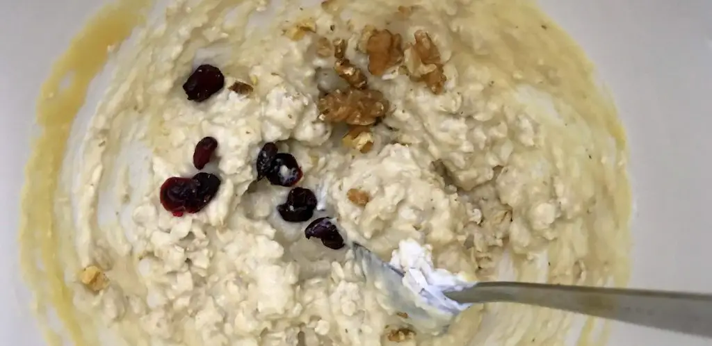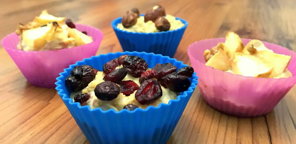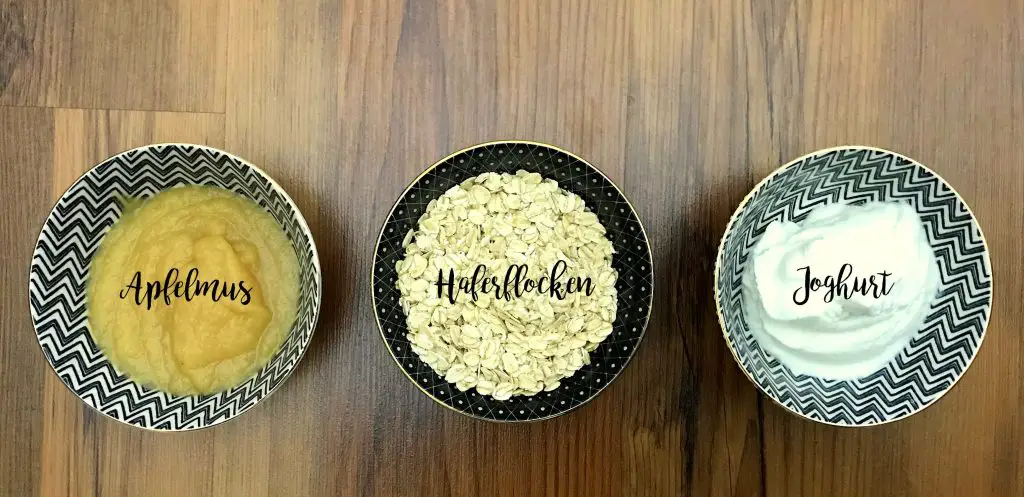 Gebt die Haferflocken, den Joghurt und Apfelmus in eine Schüssel und vermengt alles miteinander. Beliebig könnt ihr noch Früchte oder Nüsse hinzufügen. Ich habe außerdem noch eine Prise Zimt hinzugefügt. Ich liebe Zimt und packe das das ganze Jahr über fast überall ein bisschen rein!