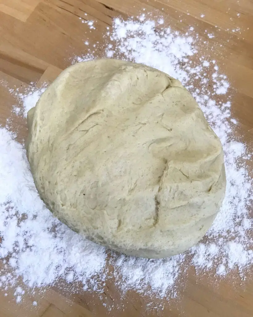 Nun gießt ihr die lauwarme Butter-Milch Masse zu den trockenen Zutaten und knetet sie so lange mit den Händen, bis ein glatter, klumpenfreier Teig entsteht.