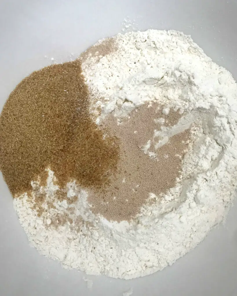 Anschließend müsst ihr das Mehl mit dem Zucker und der Trockenhefe vermischen (angeblich soll man sie vorher nicht in Wasser auflösen, weil sie sonst ihre Triebkraft verliert).