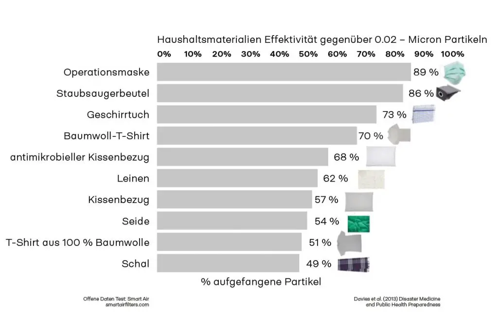 Allerdings muss es auch keine teure Operationsmake sein. Ein paar einfache Gegenstände aus dem Haushalt tun es genauso gut. Bei maskeauf findet ihr eine Übersicht von verschiedenen Mundschutzen, die nach ihrer Effektivität aufgelistet. Da tut es also auch ein Küchentuch, Kissenbezug oder Seidenschal.