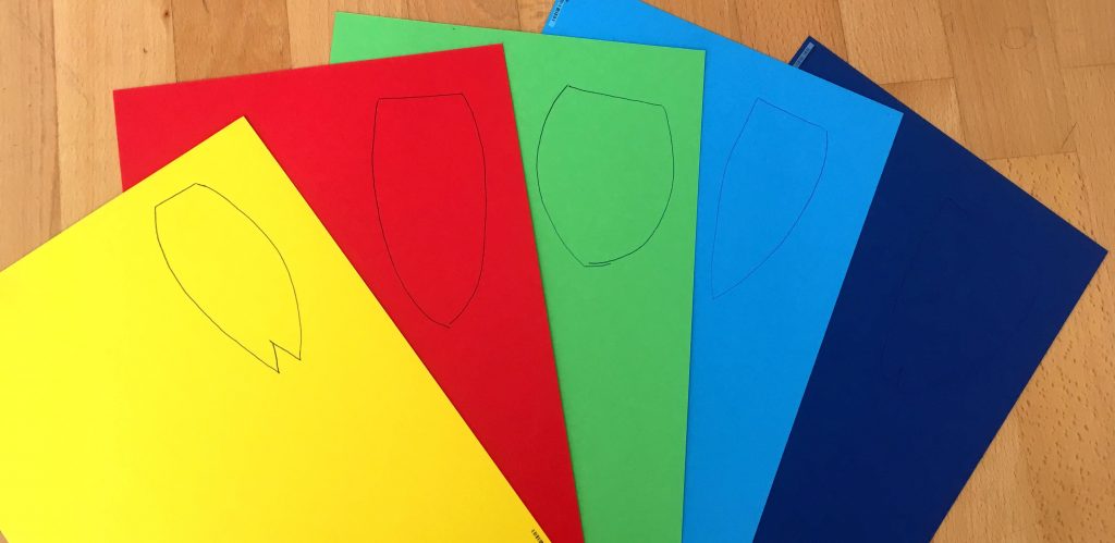 Zunächst sucht ihr euch die Farben für den Panzer des Käfers aus. Hierfür schneidet ihr die Formen eurer Wahl. Sie haben alle die Form einer Tulpe, die oben jedoch mit einem geraden Strich enden. Einige sind schmaler, andere breiter. Einige sind größer, andere sind kleiner.