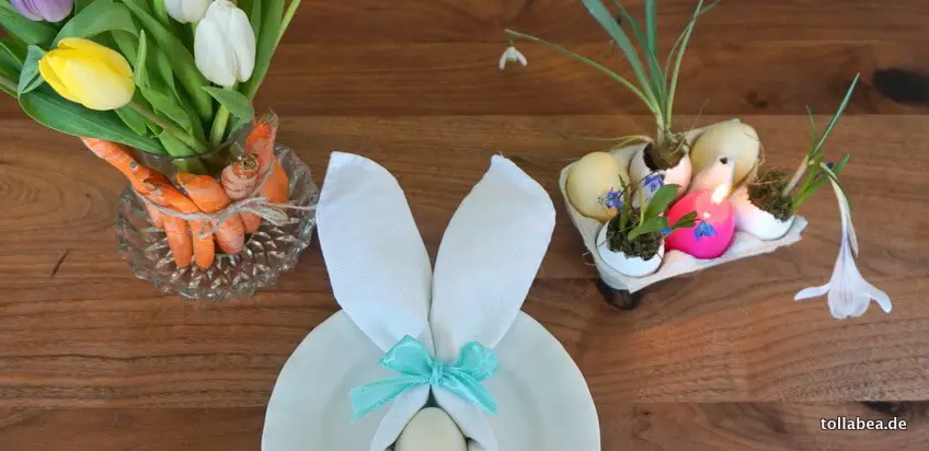 Geht super einfach. Ihr faltet eine quadratische Serviette diagonal zum Dreieck, rollt sie ab der breiten Seite zusammen und bindet mit einem Band eurer Wahl die Enden als „HasenOhren“ zusammen.
