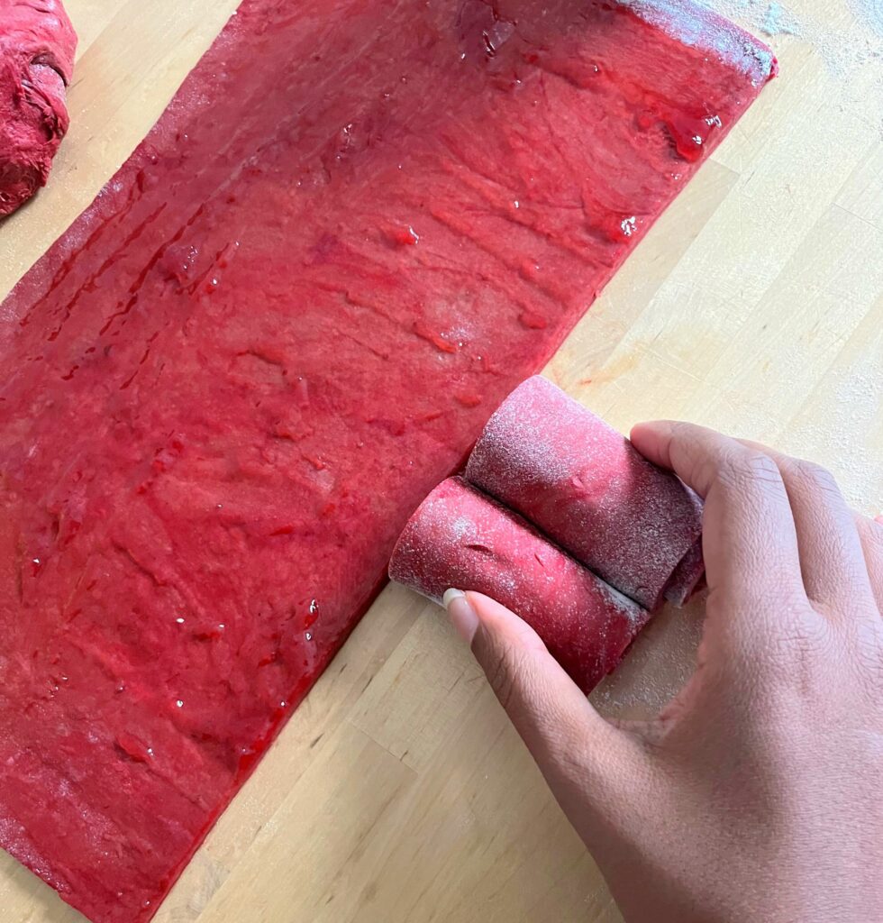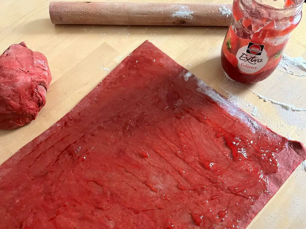 Später müsst ihr den Teig auf einer bemehlten Arbeitsfläche dünn ausrollen und mit eurem Topping bedecken (Ich hatte Erdbeermarmelade). Anschließend müsst ihr den Teig der Länge nach aufrollen und in gleichgroße Stücke schneiden.