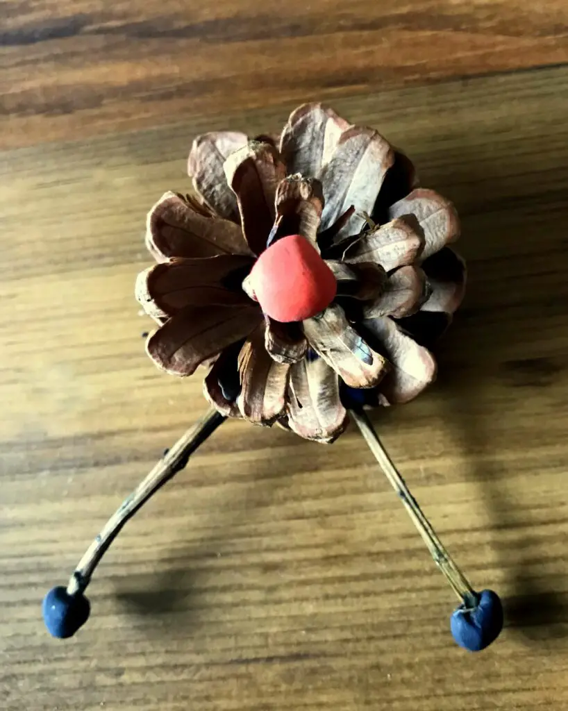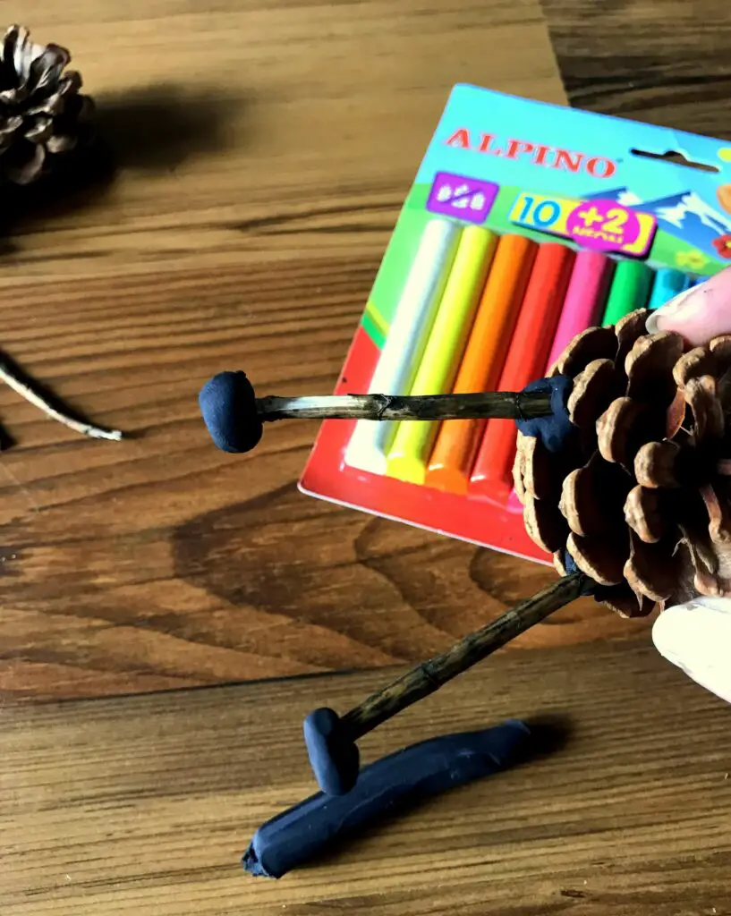 Im Grunde ist es ganz leicht. Schnappt euch einen Tannenzapfen und zwei gleichgroße Stöcke. Um sie an den Tannenzapfen zu befestigen, benötigt ihr dunkle Knete. Am besten wäre braune, aber da ich diese nicht hatte, habe ich schwarze genommen. Klebt an beiden Stockenden etwas Knete – sehr gut eignet sich lufttrocknende Knete, da diese am Ende richtig festsitzt.