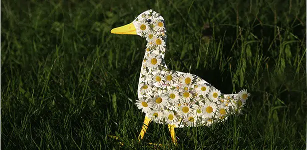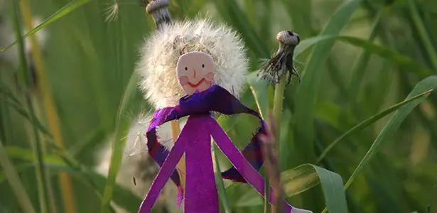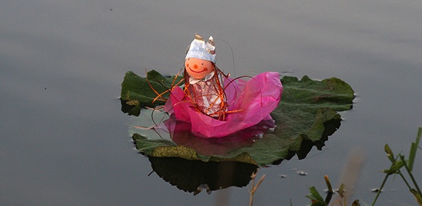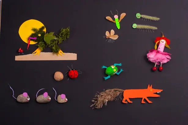 Bei den Büchern ist meistens erst einmal ein Thema da. Ein Verlag möchte zum Beispiel ein Buch über Naturbasteln machen. Dann schreibe ich eine Liste, was im Lauf der Jahreszeiten draußen wächst und schaue mich im Wald und auf der Wiese um. Beim Sehen entdecke ich meistens noch mehr. Da habe ich dann plötzlich so eine Idee, dass man aus Gänseblümchen auch eine Gans basteln könnte, oder dass eine Löwenzahnblüte aussieht wie ein Eidotter. Also die meisten Ideen entstehen direkt beim Machen. Ich habe in meinem Atelier alles Mögliche gesammelt: Zweige, Stoffe, Korken, schöne Papiere…, außerdem habe ich Farben, Pinsel, Leinwände und ein kleines Fotostudio. Dort baue ich meine Objekte zusammen, verändere sie oft noch, und dann fotografiere ich. Entweder im Studio oder manchmal auch draußen. Meine Ideen bespreche ich dann mit einer Lektorin aus einem Verlag, und wenn die alles gut findet, dann werden die Seiten zusammengestellt und layoutet, bevor es dann zum Drucken geht.
