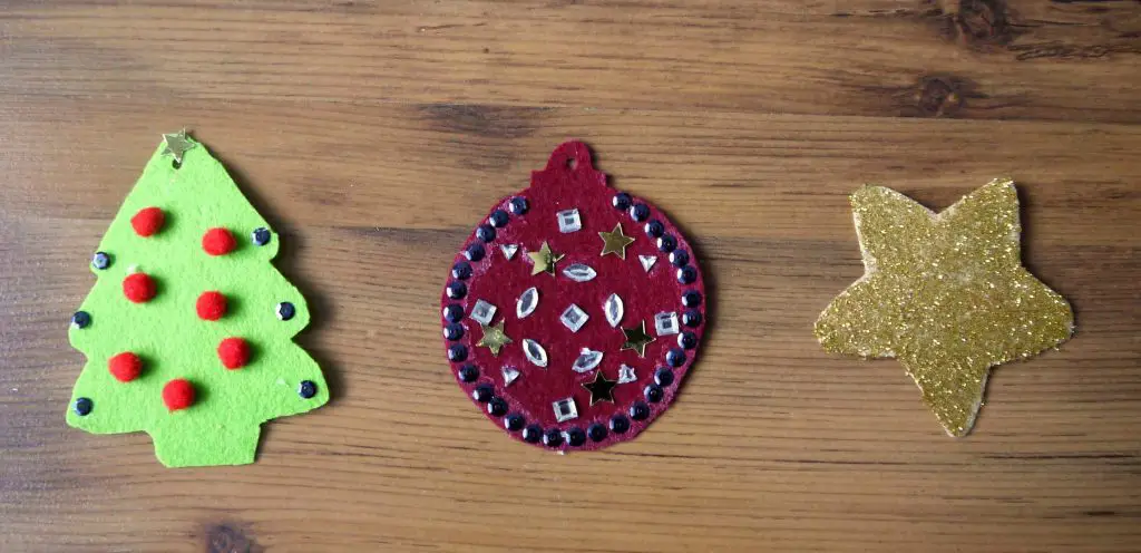 Nun ist Kreativität gefragt. Lasst eurer Phantasie freien Lauf. Malt und klebt so viel ihr wollt. Meine Weihnachtskugel habe ich mit viel Bling Bling verziert, den Stern hingegen einfach mit etwas Kleber und Glitzer bestreut. Den Weihnachtsbaum habe ich aus grünem Filz geschnitten und mit ein paar roten Kügelchen, Pailetten und einem Stern gestaltet.