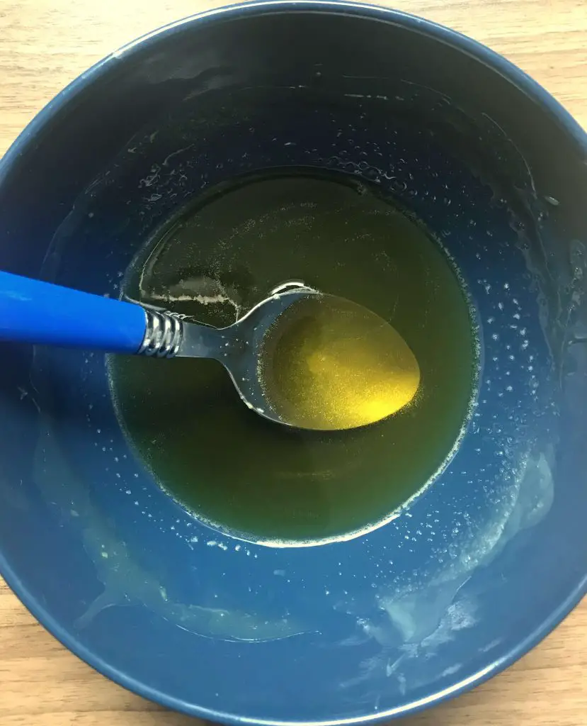 Schritt 4: Nun müsst ihr testen, ob eure Masse fest genug ist. Schnappt euch dafür einen Löffel und tropft ein bisschen Flüssigkeit auf einen Teller. Die Masse soll fest werden, aber nicht steinhart. Wenn ihr mit dem Finger darüberfahrt, soll die Masse wie Creme an euren Händen haften. Ist sie zu weich, fügt ihr noch mehr Bienenwachs hinzu, ist sie zu hart, mehr Kokosöl.
