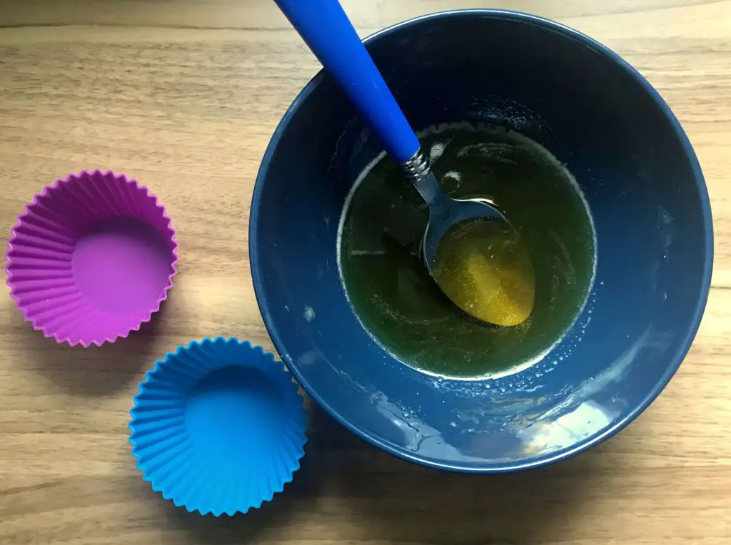 Nun zum letzten Schritt. Gießt euren selbstgemachten Mückenschutz in Silikonförmchen. Ich habe Muffinförmchen genommen und sie hineingegossen. Die Muffinform finde ich besonders handlich, weil sie danach so groß wie ein Stück feste Seife ist, über die man mit der Haut fahren kann.