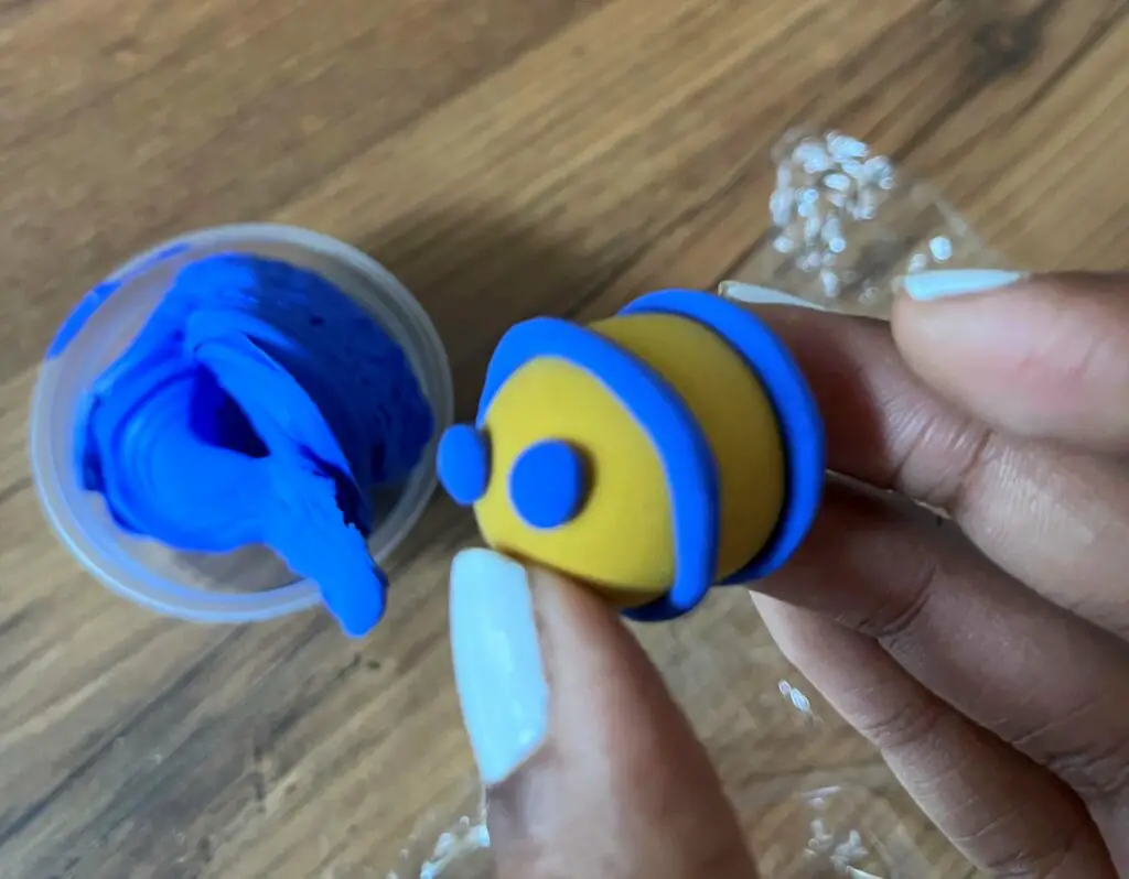 Für die Streifen habe ich statt Schwarz die Farbe Blau genommen – ich wollte meine Hummel etwas aufpeppen. Aus der Farbe formt ihr dünne Würste und wickelt zwei bis drei Streifen um das gelbe Oval.