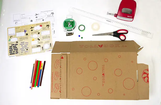 Dann: Ein Lineal, eine gut schneidende Schere (denn der Karton der Box ist recht robust), ein wenig Klebeband (entweder transparent oder kunterbuntes Washi-Tape), einen Bleistift, ein paar Stücke von einem dünnen Draht, den man mit den Händen verformen kann (wir haben Kletterdraht verwendet), einen Locher, zwei schöne Perlen (Holz oder Plastik) und ein paar Buntstifte.