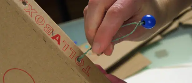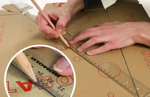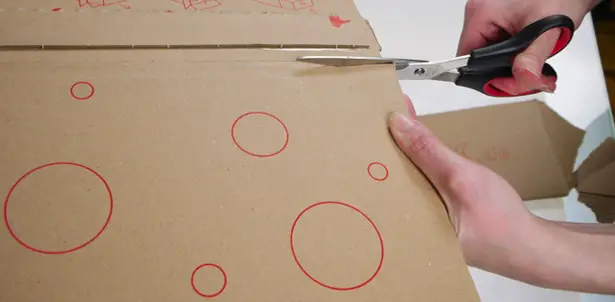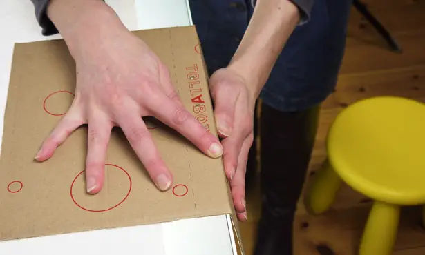 Jetzt könnt ihr den Karton entlang der gestrichelten Linien knicken. Dafür verwendet ihr am besten eine relativ scharfe Kante, wie zum Beispiel von einem Esstisch oder einer Kommode.