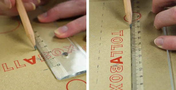 Als erstes müsst ihr die Außenhülle der Tollabox auseinander falten. Auf der großen Fläche – also quasi der Unterseite der Box – zeichnet ihr nun den Mittelpunkt ein. Das geht ganz einfach, indem man die Diagonalen mit einem Lineal misst und in der Mitte einen kleinen Strich einzeichnet. Dort, wo sich die zwei Linien treffen, ist der Mittelpunkt.
