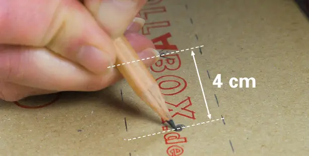 Jetzt brauchen wir noch die Markierungen für die Löcher später. Legt euer Lineal wieder auf das kleine Kreuzchen in der Mitte, das ihr ganz am Anfang eingezeichnet habt und messt nach links und nach rechts jeweils 4 cm. Markiert die beiden Stellen deutlich mit einem Punkt.