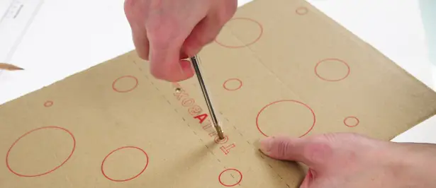 Nehmt jetzt einen Kugelschreiber oder einen anderen Stift, der spitz genug ist und bohrt die eben eingezeichneten Punkte durch, so dass ca. 3-4 mm große Löcher entstehen.