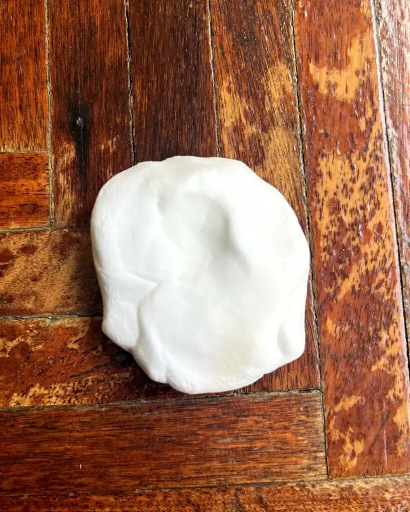Für die Blüte habe ich zunächst aus weiße Knete eine Kugel geformt und dann leicht plattgedrückt. Anschließend habe ich mit einem kleinen Messer jeweils fünf Rillen in den Teig eingeschnitten und die einzelnen Blüten mit dem Finger gedrückt. Wie ihr seht, sind die einzelnen Blüten weder akkurat symmetrisch noch fein ausgearbeitet. Das müssen sie auch nicht. 😊