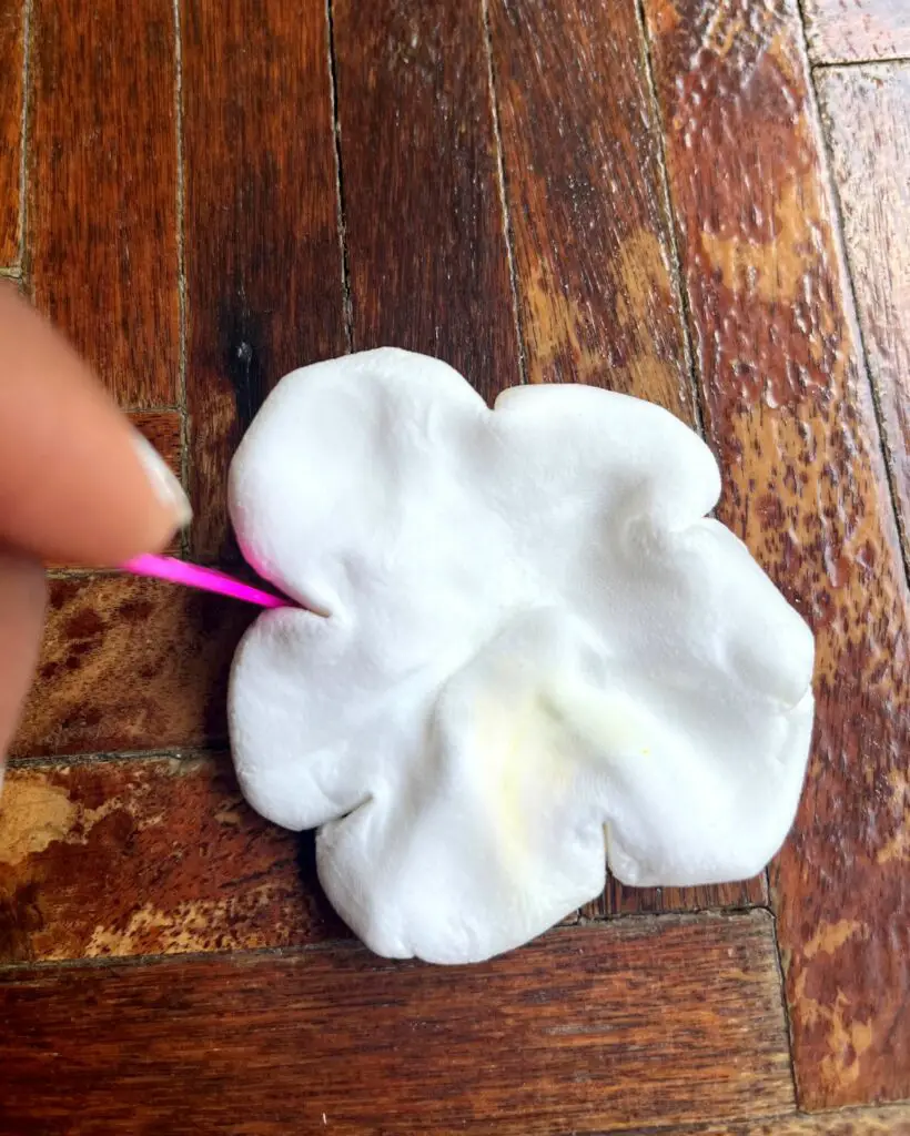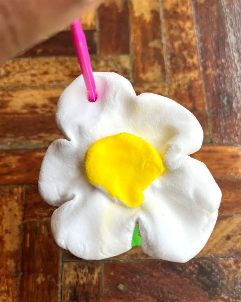 Nun fehlt nur noch ein Klecks gelber Knete, der in die Mitte der Blüte kommt. Falls ihr mögt, könnt ihr mit einem spitzen Gegenstand noch kleine Rillen in den Blütenstempel bohren.